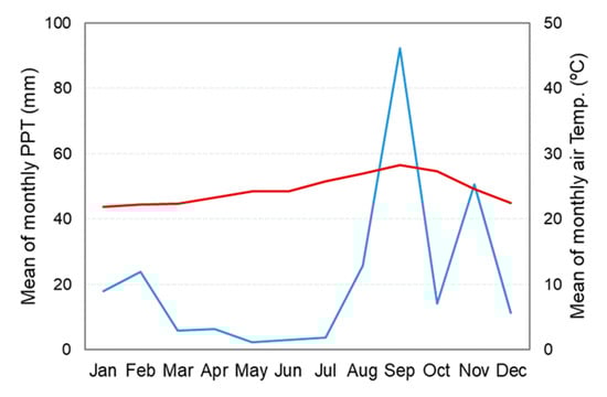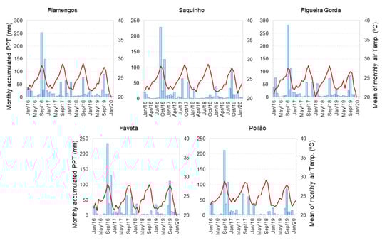 The meteorological data of air temperature and monthly accumulated precipitation during the study period were obtained from the five closest meteorological stations to the reservoirs, operated by the National Institute of Meteorology and Geophysics (Figure 4). Additionally, to characterize the extension of the dry period during the study period, a thermo–pluviometric diagram was prepared using the GAUSSEN method (Figure 5). This method considers dry months as those in which PPT < 2 T (PPT represents the monthly accumulated precipitation in mm and T the monthly mean air temperature in °C).