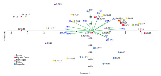 The results of the PCA for the first two axes (Figure 6) present eigenvalues of 4.72 and 2.85, respectively, which correspond to an accumulated variance of 44.51%. The first axis explains 27.76% of the total variance and presents a temporal connotation. It opposes the samplings carried out in June and May, mainly at the surface (positive side), to the samplings carried out in October and December, with higher precipitation (PPT). The parameters responsible for this ordination were, for the negative side, HCO3, TN, NH4-N, PPT, and Ca; for the positive side, they were CO3, Na, DO, K, and SO4. Note that the samples with higher scores on the negative side are from the bottom, which can be explained by the higher values of HCO3, TN, and NH4-N, where the effects of precipitation on the input of organic nutrients from the basins are visible. The second axis (16.76% of the total variance) split the samples collected in Saquinho reservoir on the negative side. Moreover, the negative part of the axis contained the Poilão reservoir sampled in October, characterized by higher values of DO, pH, and TP, in opposition to the samples with higher values of Mg, Cl, Si, and Na, mainly from February and December (positive scores on the axis).