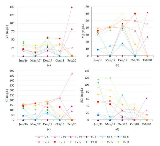 Graphs with the physicochemical descriptors responsible for the significant differentiation among reservoirs (results of Kruskal–Wallis tests): (a) Calcium (Ca, mg/L), (b) magnesium (Mg, mg/L), (c) chlorides (Cl, mg/L), (d) sulfates (SO4, mg/L). Reservoirs are represented by different shapes and colors, and the codes include FL—Flamengos reservoir, SA—Saquinho reservoir, FG—Figueira Gorda reservoir, FV—Faveta reservoir, PO—Poilão reservoir, S—Surface, B—Bottom, P1—Pool 1, the big pool in Flamengos, P2—Pool 2, the small pool in Flamengos. XX axis show sampling date M/YY.