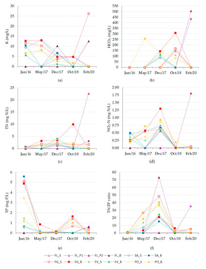 Figure 8 shows the temporal evolution of the physicochemical parameters that significantly differentiated the five campaigns through the application of Kruskal–Wallis tests (K, p < 0.001; HCO3, p < 0.01; TN, p < 0.001; NO3-N, p < 0.001; TP, p < 0.001; and N:P, p < 0.05). For K, June 2016 and May 2017 do not differ from each other, but are significantly higher than December 2017 (p < 0.05) and October 2018 (p < 0.01). In turn, December 2017 and October 2018 do not differ from each other but are significantly lower than February 2020 (p < 0.01 and p < 0.05, respectively). For HCO3, June 2016 is significantly lower than December 2017 (p < 0.05), October 2018 (p < 0.01), and February 2020 (p < 0.05). In turn, May 2017 is significantly lower than October 2018 (p < 0.05), and December 2017 is significantly lower than October 2018 (p < 0.05). In February 2020, there was a larger variability in the magnitude of the data vector (min = 0.0 mg HCO3/L, max = 506.1 mg HCO3/L), and consequently did not differ from any of the other samplings. For NO3-N, June 2016 is significantly lower than May 2017 (p < 0.05), December 2017 (p < 0.001), and October 2018 (p < 001). Sequentially, May 2017 differs from December 2017 (p < 0.05) and October 2018 (p < 0.01), and December 2017 is significantly different from October 2018 (p < 0.01). Similarly, in February 2020, there is greater variation in the data vector (min = 0.043 NO3 mg N/L, max = 506.1 NO3 mg N/L), although not differing from the other sampling campaigns.