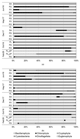 - INAG, I.P. Manual para a Avaliação da Qualidade Biológica da água. Guia de Utilização da Tabela de Valores-Guia Normalizados de Biovolumes e Determinação do Biovolume Através de Procedimentos Laboratoriais; Ministério da Agricultura, Mar, Ambiente e Ordenamento do Território. Instituto da Água, I.P.: Lisbon, Portugal, 2011; 11p. [Google Scholar]