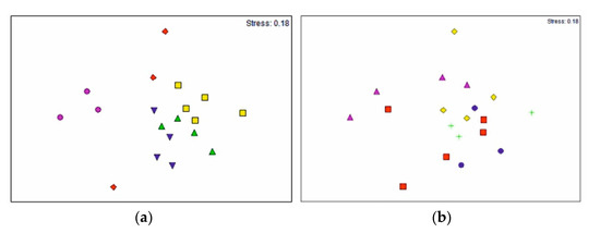 - Clarke, K.; Gorley, R. Non-parametric multivariate analyses of changes in community structure. Aust. J. Ecol. 1993, 18, 117–143. [Google Scholar] [CrossRef]