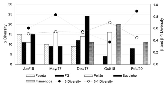 In order to evaluate how α diversity varies along the temporal gradient of the study period, and to follow the renewal or replacement of taxa over the study period, the beta diversity (β) was determined through the utilization of two different indexes The first is a dissimilarity index of β − 1 [77], which measures how much regional diversity exceeds the average α diversity, calculated by the expression where S is the regional diversity (gamma diversity [γ], number of taxa in the group of reservoirs in each period), αmedium is the average α diversity for the group of reservoirs in each period, and N is the number of reservoirs in the period. The second is a similarity index (Sorensen index), which measures how much the average similarity exceeds the γ diversity, calculated by the expression where C corresponds to the number of common taxa and S is the regional diversity.