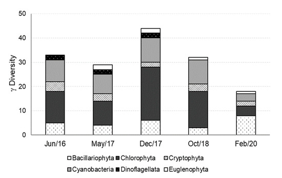 - Moresco, G.A.; Bortolini, J.C.; De’o Dias, J.; Pineda, A.; Jati, S.; Rodrigues, L.C. Drivers of phytoplankton richness and diversity components in Neotropical floodplain lakes, from small to large spatial scales. Hydrobiologia 2017, 799, 203–215. [Google Scholar] [CrossRef]