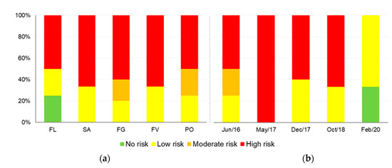 The global and individual reservoir risk levels for each sampling period were determined according to the WHO Guidelines in Bathing Waters [78], using the Cyanobacteria cell density criterion, based on four different classes: (i) No Risk (no detection of Cyanobacteria), (ii) Low Risk (Cyanobacteria density <20,000 cells/mL), (iii) Moderate Risk (Cyanobacteria density between 20,000 cells/mL–100,000 cells/mL), and (iv) High Risk (Cyanobacteria density >100,000 cells/mL). Despite the fact that this criterion was specifically proposed for bathing waters, it constitutes a good indicator for the assessment of potential risk for animals and human exposure/contact.