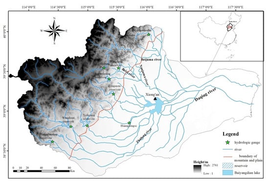 The plan to construct the Xiongan New Area, which was reported by China’s Central Committee and State Council, is regarded as “a strategy crucial for the millennium to come” by the Chinese government (http://politics.people.com.cn/GB/n1/2017/0401/c1001-29185929.html, in Chinese; access date: 8 October 2021). The Xiongan New Area prioritizes eco-environmental protection and green living environments. One noticeable characteristic of Xiongan is that it is located next to Baiyangdian Lake, the largest natural freshwater wetland on the semiarid North China Plain (NCP), which is known as the “Pearl of North China” and the “Kidney of North China” [,,]. The lake is located in the middle and lower reaches of the Daqing River basin, which is a typical mountain basin in northern China and has an important impact on the central North China Plain in terms of climate regulation and environmental characteristics []. Due to the steep terrain, thin soil cover, poor vegetation and fan-shaped tributary distribution of the area and the characteristics of high intensity, short duration, uneven distribution and sudden occurrence of the storm events that occur in the Daqing River basin, floods with high and concentrated peaks with short lead timesare often triggered [], which easily cause significant flooding and serious soil erosion. The New Area is located in a region of slow flooding and stagnation on the Daqing River, and its current flood recurrence period is only one in ten years; the area has suffered many flood disasters []. Sudden flash floods cause a large amount of coarse sand gravel to pile up in the downstream channel, destroying villages, burying farmland and causing siltation of river channels, which all bring considerable economic losses to the local people.