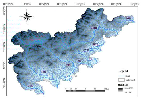 Because of the small mountainous area of the Bao River, we extracted the river network and watershed boundaries of the other nine tributaries in mountainous areas from a DEM, including the Ci River, Sha River, Tang River, Jie River, Cao River, Zhongyi River, Beiyi River, Juma River and Dashi River (Figure 2).