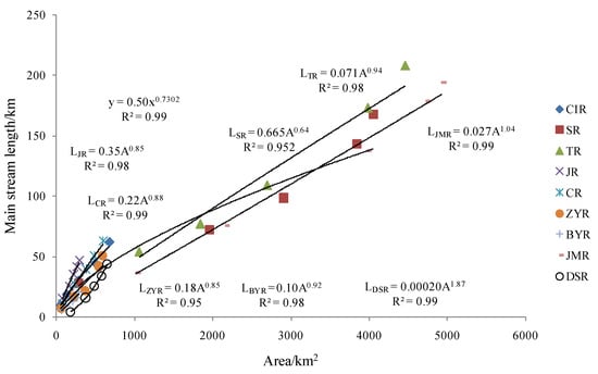 Correlation of the main stream length and area of mountain watersheds in the Daqing River. (referring to Figure 2 for the abbreviated names of rivers).
