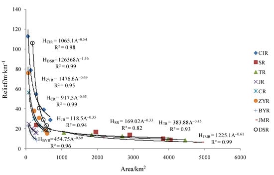 Correlation of relief and area of mountain watershed in Daqing River. (referring to Figure 2 for the abbreviated names of rivers).