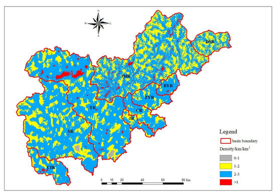 Spatial distribution of drainage density in mountain watersheds of the Daqing River (referring to Figure 2 for the abbreviated names of rivers).