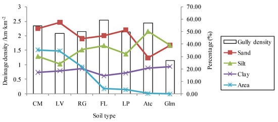 Dd was the lowest in Glm (1.15 km/km2) and the highest in FL (2.54 km/km2). For the other soil types, Dd was between 2 and 2.5 km/km2. If soil particles are coarse and the permeability of the soil is high, the soil corrosion factor K value is low []. Melton [] also found that Dd decreased with soil infiltration capacity. Figure 6 shows that the coarse gradation content of FL was the highest, at 85.5%. Thus, we can explain why the Dd of FL was the largest. The ability to resist soil erosion influences Dd. In addition, although the sand content of Atc was low, the Dd as relatively high, at 2.44 km/km2. It can be concluded that soil erosion is affected not only by soil properties but also by anthropic factors.