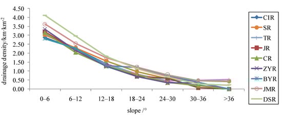 Distribution of drainage densities in different slopes of mountain watersheds in the Daqing River (referring to Figure 2 for the abbreviated names of rivers).