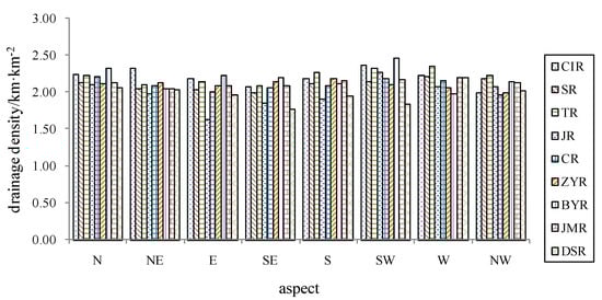Aspect is an important terrain factor. Some studies have shown that the differences of rainstorms, rainfall erosivity, soil moisture and vegetation growth conditions make the soil erosion pattern and intensity in different aspects have obvious asymmetry []. For revealing the impacts of aspects on drainage development in the Daqing River, we divided the slope aspect into north (N), northeast (NE), east (E), southeast (SE), south (S), southwest (SW), west (W) and northwest (NW). There were differences in Dd on each aspect. The maximum Dd was 2.45 km/km2, and the minimum was 1.63 km/km2 (Figure 8). SPSS was used to compare and test the average Dd of each aspect, and they had values of 2.16 km/km2 (N), 2.08 km/km2 (NE), 2.03 km/km2 (E), 2.02 km/km2 (SE), 2.10 km/km2 (S), 2.20 km/km2 (SW), 2.16 km/km2(W) and 2.07 km/km2 (NW). In the formation process of the gullies, there was a directivity of upstream erosion, subdivision of gullies and development of branches. Relatively speaking, the gullies in the southwest, north and west developed considerably, while gullies in the east and southeast did not develop much. The measurement coefficient of the linear correlation between drainage density and aspect was 0.44, p = 0.042 < 0.05, which passed the significance test. This indicated that aspect influenced drainage density, but the two did not have a simply linear relationship. This is because the difference in aspect results in differences in other influencing factors, such as rainfall and solar radiation, and the change in vegetation growth caused by different solar radiation leads to different development and evolution of erosion gullies [].