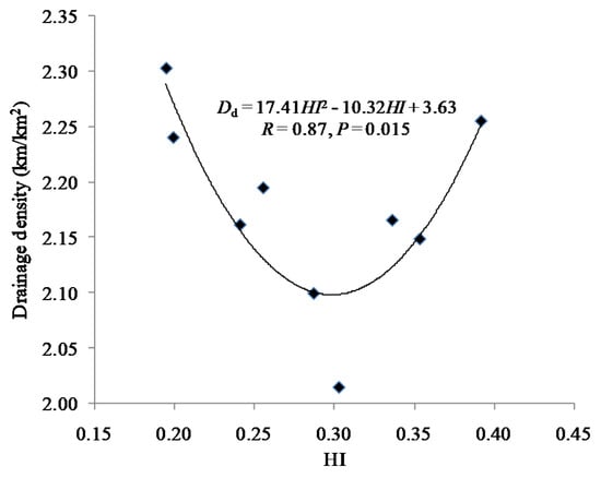 As shown in Figure 9, the HI values in the mountain basins of the Daqing River were all below 0.4. The correlation between HI and Dd was significant (R = 0.87, p = 0.015), but these factors were not simply linearly related. With the increase in HI, Dd first decreased and then increased. With 0.3 as the boundary, the closer HI was to 0.3, the smaller Dd was, and conversely, the larger Dd is. It was concluded that the landform of the mountain basin of the Daqing River is in an advanced stage of erosion development and that Dd will no longer increase [].