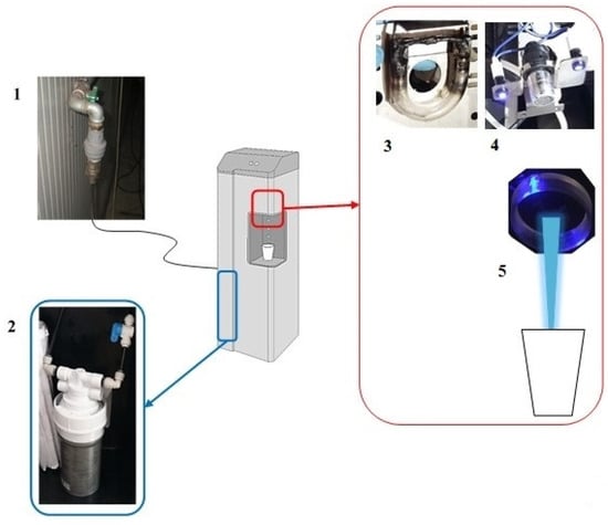 Schematic representation of Microfiltered Water Dispensers (MWDs) from our previous study (Girolamini et al. 2019): 1: Input from municipal water, 2: Activated carbon filter, 3: UV Lamp at water supply point, 4: UV lamp, without glass, and water supply point (output), 5: Water supply nozzle (output).