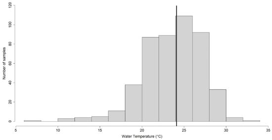 Figure 2 shows how most samples were centered around the median value of 24.1 °C, a temperature value close to the reference limit threshold of 25 °C [28].