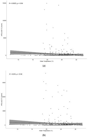 Moreover, data were evaluated to find a possible correlation between HPCs at 36 °C and 22 °C and the temperature of samples measured, as shown in Figure 3a,b. There was no significant correlation with a p = 0.96 and p = 0.58 for HPCs at 36 °C and 22 °C, respectively.