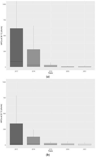(a) Boxplot graph showing a decreasing trend for heterotrophic plate counts (HPCs) at 36 °C observed during the period of analysis, from 2017 to 2021. Outliers are not displayed. (b) Boxplot graph showing a decreasing trend for heterotrophic plate counts (HPCs) at 22 °C observed during the period of analysis, from 2017 to 2021. Outliers are not displayed.