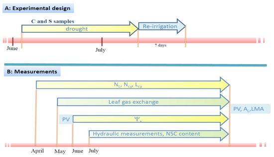 Figure 1. (A) Experimental design and (B) measurements performed on control and stem-shaded samples (C and S, respectively) of L. nobilis and P. alba plants; (A) At the beginning of June, C and S samples were subjected to a water stress treatment. One month later, a set of samples was measured for different physiological parameters. Another set of plants was re-irrigated at field capacity and measured after 7 days to evaluate the capacity for recovery; (B) Leaf gas exchange rates were measured from May to the end of the experiment; xylem water potential (Ψx) values were recorded from June to the end of experiments; hydraulic measurements and NSC content were performed after the drought treatment and 7 days after re-irrigation. Moreover, PV-curves were measured before and at the end of the drought-recovery treatments. Leaf area and leaf mass per area were measured at the end of the experiments (for details, see the text). PV: pressure volume curves; NL: number of leaves of the current-year branches; Ncy: number of current-year branches; Lcy: length of the current-year branches; AL: leaf area; LMA: leaf mass area.