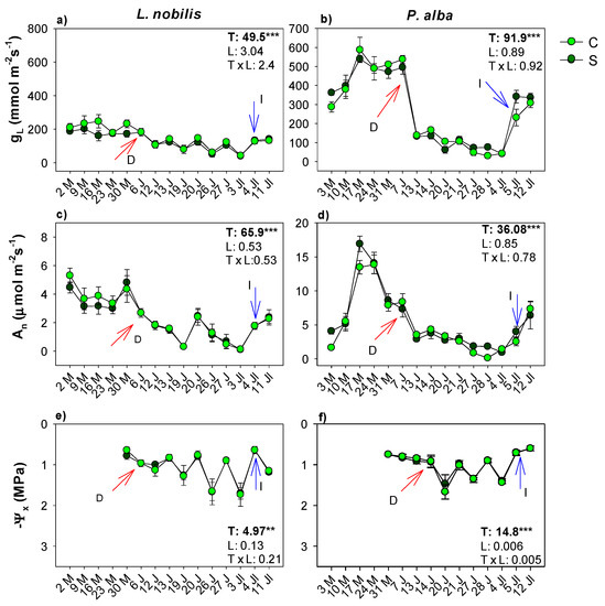 Figure 2. Mean values ± SEM of (a,b) stomatal conductance to water vapor, gL; (c,d) photosynthetic rate (An) and (e,f) xylem water potential (ΨX) as recorded in May (M), June (J) and July (Jl) in control (C, light green circle) and shaded samples (S, dark green circle) of L. nobilis and P. alba plants. Arrows indicate the day starting drought treatment (D) and re-irrigation (I). F values, as obtained by the two-way ANOVA analysis, are reported. Time of measurement, T, and light treatment, L (i.e., control and shaded samples) are the explanatory variables ** = p < 0.01; *** = p < 0.001.