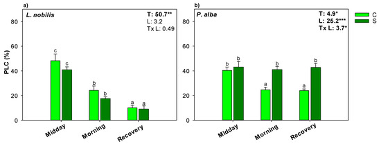 Figure 3. Mean values ± SEM of percentage loss of hydraulic conductivity (PLC) as recorded in control (C) and shaded stem (S) samples of L. nobilis (a) and P. alba (b) as measured at midday, on the following morning (Morning) as well as in samples re-irrigated at field capacity and measured 7 days after re-irrigation (Recovery). Light green and dark green columns refer to C and S samples, respectively. F values, as obtained by the two-way ANOVA analysis, are reported. Time of measurement, T, and light treatment, L (i.e., control and shaded samples) are the explanatory variables. * = p < 0.05; ** = p < 0.01; *** = p < 0.001.