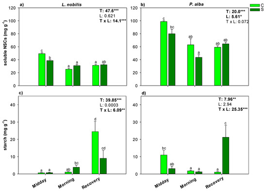 Figure 4. Mean values ± SEM of (a,b) soluble NSCs and (c,d) starch content as recorded in control (C) and shaded stem (S) samples of L. nobilis and P. alba at midday, on the following morning (Morning) and at morning after re-irrigation at field capacity (Recovery). Light and dark green columns refer to C and S samples, respectively. F values, as obtained by the two-way ANOVA analysis, are reported. Time of measurement, T, and light treatment, L (i.e., control and shaded samples) are the explanatory variables. * = p < 0.05; ** = p < 0.01; *** = p < 0.001.