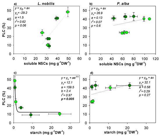 The differences in NSC and PLC trends led to a significant relationship between starch content and the corresponding PLC values in L. nobilis but not in P. alba (Figure 5c,d). Moreover, a linear correlation near to be significant (p = 0.06) was also recorded between soluble NSCs and PLC values in laurel samples but not in poplar plants.