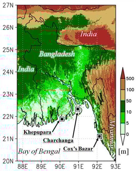 Topography around the Bangladesh coast and the locations of the selected study sites. The Cox’s Bazar station is located at 21.45° N and 91.95° E, Charchanga at 22.22° N and 91.06° E, and Khepupara at 21.85° N and 90.08° E.