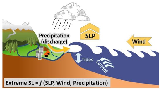 Contributing factors for extreme sea levels. The meteorological factors contributing to the extreme sea level are indicated in orange. SLP represents sea level pressure.