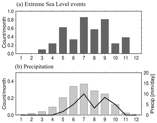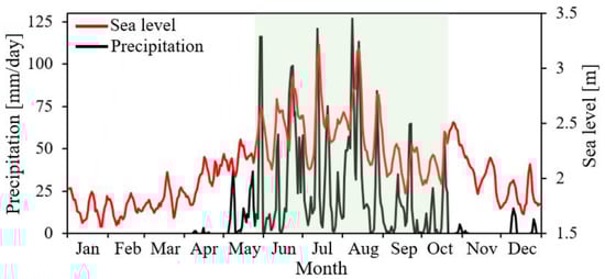 This study investigated the possible effect of terrestrial precipitation of daily ESL for many events. It is widely known that this region is one of the wettest regions in the world [29,56,58], having a peak precipitation associated with the summer monsoon. Fujinami et al. [70] pointed out that sub-monthly intraseasonal precipitation variability shows a significant contribution to the variability of annual precipitation. It is hoped that future studies will analyze the possible influence of intraseasonal precipitation variability to improve the predictability of sea level variations.