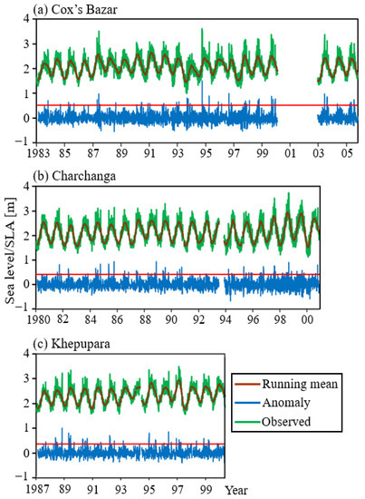 The sea level near the Bangladesh coast exhibits prominent seasonal variation [38] corresponding to the monsoon [39] and regular tidal cycles. An example of the seasonal variation of the daily sea level at Cox’s Bazar station for a one-year period of 1998 is shown in Figure A1. The figure shows a seasonal variation in sea level corresponding to pre-monsoon, monsoon, and post-monsoon seasons. To remove such low-frequency components, daily sea level anomalies (hereafter referred to as SLA) relative to the 91-day running mean were used. As demonstrated in Figure 4, the SLA represents the high-frequency daily sea level variations caused by meteorological factors and river discharge. Then, the ESL events were determined by applying the threshold value of the 99th percentiles in the daily SLA time series, following the method of previous studies [40,41]. The 99th percentile high SLA values were 0.562 m, 0.486 m, and 0.427 m (indicated by red lines in Figure 4), and the number of selected ESL events were 69, 62, and 37, respectively, for Cox’s Bazar, Charchanga, and Khepupara station.