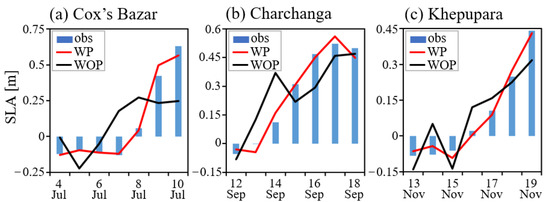 (a) The observed SLA (bar) and predicted SLAs for the prediction with precipitation (WP, red line) and without precipitation (WOP, black line) at Cox’s Bazar for the case of ESL on 10 July 2006. (b,c) same as (a) but for Charchanga on 18 September 1997 and Khepupara on 19 November 1988, respectively.