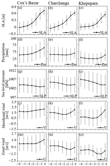 The average time series (line) of SLA, Pre, SLP, U, and V for all ESL events at Cox’s Bazar (a,d,g,j,m), Charchanga (b,e,h,k,n), and Khepupara (c,f,i,l,o). The error bars represent the standard deviation of the cases. The values on the x-axes represent the day, ranging from −6 to 0, corresponding to six days before (t = −6) the targeted day of the ESL event (t = 0).