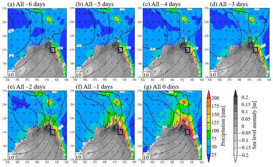Composite map of the variables for each prior day (a–f) and the day of extreme (g) for all ESL events at Cox’s Bazar during 1993–2006. Here, the analysis was performed for the period 1993–2006, considering the availability of gridded SLA data. The gray shading over the ocean represents SLA (m), and the color shading over the land represents accumulated precipitation during the five preceding days (mm). The contour and vector are for SLP (hPa) and surface wind (m/s), respectively. The rectangles denote the location of the Cox’s Bazar station. Please note that the sea level anomaly drawn here is defined as the deviation of sea level from its 20-year (1993–2012) climatological mean [37].