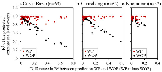 The relationship between the R2 values of sea level predictions based on MLR for WP and WOP at (a) Cox’s Bazar, (b) Charchanga, and (c) Khepupara. Each dot corresponds to an ESL event. Red and black dots represent R2 for predictions WP and WOP, respectively. The y-axis represents the R2 for predictions WP. The x-axis represents the differences in R2 between WP and WOP predictions.