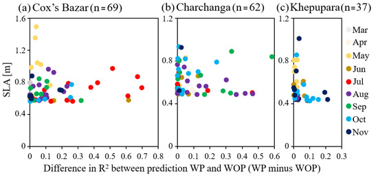 Figure 10 shows the relationship between SLA and the R2 difference between two predictions. Here, we used the difference as a measure to quantify the influence of the precipitation effect (c.f., Section 2). In Cox’s Bazar, ESL events with a high influence of precipitation tended to occur in June and July (Figure 10a), corresponding to the peak precipitation during the summer monsoon (Figure 9b). Figure 9a,b also confirmed that the simultaneous increases of ESL events and heavy precipitation in 1999, as shown in Figure 3, are common characters for many years. Interestingly, the highest SLAs were observed in May (Figure 10a), and the difference in R2 for these events was generally small. We confirmed that these events mostly occurred in early May in 1995 and 1997, and there were tropical cyclones or tropical depressions over the study area [59,60]. Hence, it is very likely that these ESL events were strongly influenced by SLP and winds, rather than the precipitation effect. For such cases, since R2 was originally very high, predictions WP and WOP did not differ largely. In June and July, the effect of precipitation at Cox’s Bazar was thought to be enhanced because the precipitation amount was high in these months (Figure 9b). In Charchanga, the ESL events with a large R2 difference occurred during the post-monsoon period from August through to September (Figure 10b). The frequency of heavy precipitation events remained high in these months, leading to the possibility of a large contribution of precipitation. At Khepupara, the differences in R2 were found during October and November, corresponding to the post-monsoon season, although the magnitude of the R2 difference was smaller than other stations (Figure 10c). The impact of precipitation on the skill of MLR predictions varied among stations and seasons. It has been suggested that the impact was high in Cox’s Bazar and Charchanga for July and September–October, respectively. These months agree well with the month of highest precipitation for the study area (Figure 9b), as mentioned in previous studies [30,57,58].