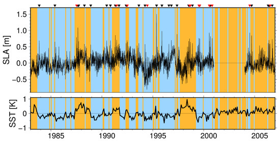 Time series of (upper) daily SLA at Cox’s Bazar and (lower) monthly mean SST anomaly over the Bay of Bengal (5°–23° N and 80°–99° E). Shading indicates the period of positive (orange) and negative (blue) SST anomaly. The triangle plotted on the top denotes the day of the ESL event. The red triangle indicates the ESL event at which the R2 difference was greater than 0.3. The station SLA data are missing during 2001–2003.