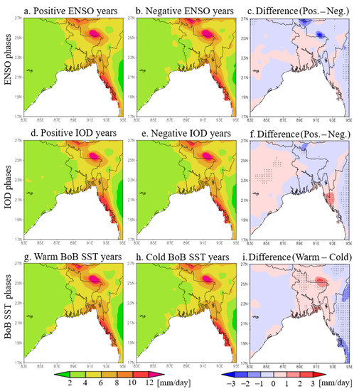 Mean precipitation (mm/day) during (a) positive and (b) negative ENSO years. (c) Difference in precipitation between positive and negative ENSO years. (d,e) Mean precipitation during positive IOD and negative IOD years and (f) their difference. (g,h) Mean precipitation during warm and cold BoB SST years and (i) their difference. The dots in (c,f,i) represent that the difference is statistically significant at the 95% confidence level.