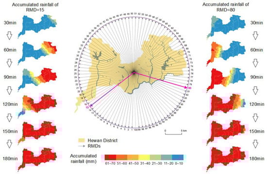 We designed the idealized experimental conditions of rainfall intensity (RI) and RMD to construct comprehensive rainfall schemes. According to the RI value of 132.7 mm/h recorded once every 1000 years in Shenzhen, we constructed 13 RIs with 10 mm intervals from 10 mm/h to 130 mm/h, and chose the commonly used Chicago rain pattern (Table 1) to represent short-term rainfall. In addition, 100 moving directions with equal intervals were designed to reflect the continuous RMD. We collected rainfall monitoring data from 63 meteorological stations in Shenzhen from 2008 to 2018, with a time resolution of 5 min. The rainfall events were extracted from the data and the rainfall center of every 5 min is calculated, then the moving speed of each rainfall events is calculated through the movement of the center. The average speed of all rainfall events is about 10 km/h.The asynchronous rainfall process of the whole basin is set to 3 h based on the average moving speed of the rainfall center (10 km/h) and the diameter of the circumscribed circle of the basin (30 km). By combining RI and RMD, 1300 rainfall processes (13 RIs × 100 RMDs = 1300) were constructed in Figure 1. The two rainfall distribution maps in Figure 1 show distributions when the RI is 80 mm and the RMDs are 15 and 80 respectively.
