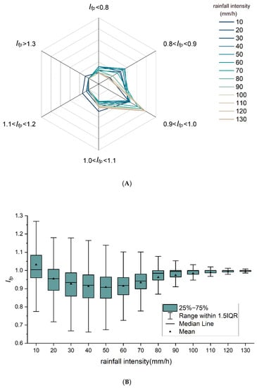 We found that the influence of variation in RI and RMD combinations on the peak runoff can reach 30% based on the index of peak runoff deviation (Ifp) in the study area. The statistics of 538,200 Ifps show that the variations in the RI and RMD are more likely to cause negative effects on peak runoff, with 77.1% of Ifps < 1.0 and 22.9% of Ifps > 1.0. However, this influence is always ignored, possibly due to most Ifps (83.3%) ranging from 0.9 to 1.1, indicating that the effect of these variations is smaller than 10% in most instances. Additionally, a heavy RI will reduce the effect of RMD on the peak runoff, with more concentrated of Ifps value of approximately 1.0 correspondingly with the more enhanced RI. We found that 96% of Ifps values ranged from 0.9 to 1.1 when RI > 70mm/h. Furthermore, the range of Ifps decreased to 0.95–1.05 when the RI reach an extreme value larger than the once-in-one-hundred-years value (100 mm/h). We also found that the duration of the peak runoff was lengthened with extremely high RI values (Figure 3), which is associated with the processes of drainage networks operating under maximum waterlogging-elimination capacities. Figure 3A shows that the heavier the RI is, the more concentrated the Ifp is between 0.9 and 1.1, and the number of Ifp values less than 1.0 is obviously greater than that of Ifp values more than 1 for all RIs. Figure 3B shows that with an increase in the RI, the fluctuation range of Ifp decreases obviously and tends toward 1.0.