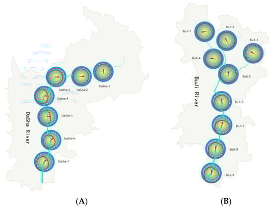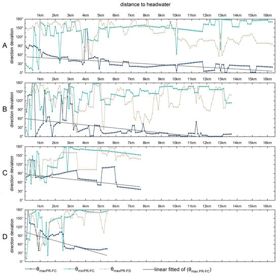 To further understand how RMD affect the peak runoff, we calculated three angles of sections: θmaxPR-FC (the angle between RMD with maximum peak runoff and flow concentration direction), θmin PR-FC (the angle between RMD with minimum peak runoff and flow concentration direction) and θmax PR-FD (the angle between RMD with maximum peak runoff and flow direction). In this paper, we used “Linear Directional Mean” (LDM) to represent the flow concentration direction, which is the geometric mean of all the reaches upstream. In contrast with the flow direction, we do find a significant relationship between RMD and the flow concentration direction during maximum peak runoff (Figure 6), with decreasing trends of θmaxPR-FC from upstream to downstream. For example, the angles of the second half of downstream reaches of the Buji River are almost smaller than 20°, and some sections even reach 0°. In contrast, θminPR-FC is gradually increased with the opposite RMD to θmaxPR-FC, which is consistent with the result of model 2 shown in Figure 4. Additionally, the θmax PR-FC values are larger in more meandering rivers (e.g., Dasha River) than in rivers with straight channels (e.g., Buji River). We can therefore conclude that RMD is a significant factor to peak runoff downstream in urban areas, and this influence is not isolated but needs to be combined with the spatial feature of rivers such as direction and bending.