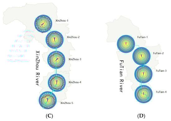 Influence of the peak runoff on the sections of four rivers. (A) Dasha River. (B) Buji River. (C) Xinzhou River. (D) Futian River. Only certain parts of the 414 sections are drawn.