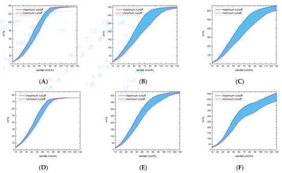 The peak runoff ranges with the same rainfall intensity (RI) value but different RMDs for 6 river sections. (A), section 50 of the Dasha River. (B), section 100 of the Dasha River. (C), section 150 of the Dasha River. (D), section 30 of the Buji River. (E), section 80 of the Buji River. (F), section 130 of the Buji River.