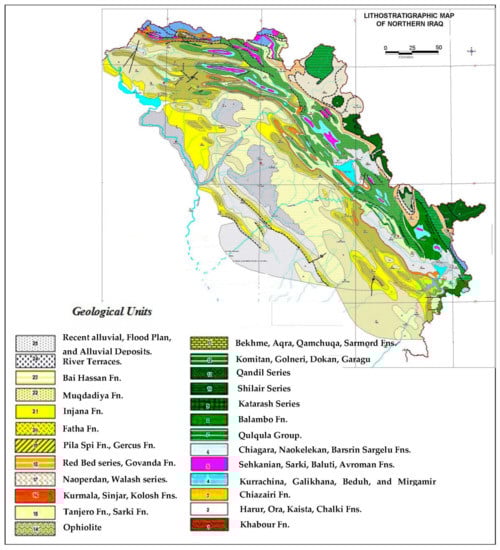 | Late Cretaceous | Dokan, Gulneri, Komitan, Aqra, Bekhme, Shiranish, and Tanjero formations | Limestone, grey dolomite-containing bituminous limestone, blue-grey marl, and beds of marly limestone |