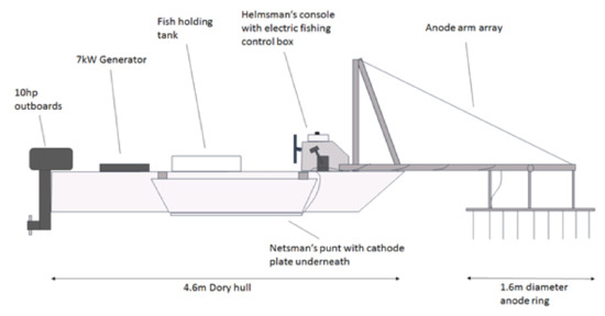 Electric fishing surveys deployed a boom-boat arrangement (Figure 2) with pulsed direct current and output settings at 230 V, 50 Hz and 10–11 A. Power to a model FC3000GPBS control box (Electracatch International; Wolverhampton, UK) was supplied by a 7 kW Honda EU70is petrol generator. Output (230 V, max current 20 A) was then fed out to a pair of anode arrays on booms which sit at river surface level. The two cathode cables were fixed, one to each side of the boat, to stainless steel plates situated beneath the netting punts. Surveys involved timed runs carried out in a downstream direction. Surveys were conducted in the river margins and at mid-river locations and started around dusk each night. The results are presented as catch per unit effort (number per minute) estimates. All captured fish were identified to species level and fork length measured to the nearest mm. Within each reach, and for each species, scale samples from a minimum of three individuals per 10 mm size band were taken for age and growth analysis.