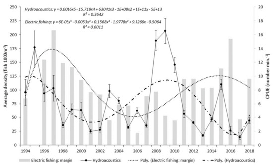 Hydroacoustic long term average density for the study area (1994–2018) was 75.58 ± 22.65 fish 1000 m−3.