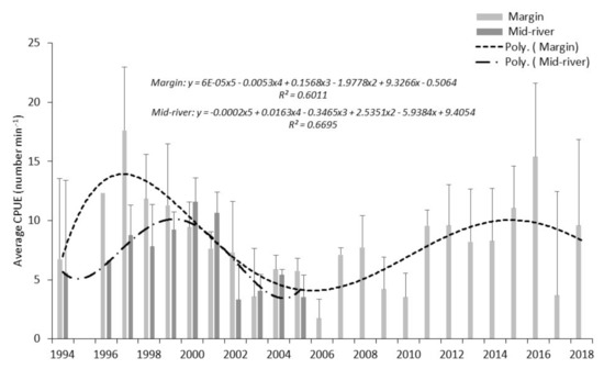 Combined all reach variation in average annual catch per unit effort (number min−1; upper 95% confidence limit) for margin and mid-river boom-boat electric fishing surveys conducted from 1994 to 2018 with best fit 5th order polynomial trend lines and calculated coefficients of determination applied.