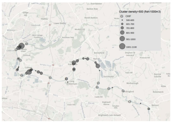 Centroid locations of contour cluster single target fish density (>500 fish 1000−3) greater than 100 m centroid-centroid spacing derived from GIS modelled inverse distance weighted three-dimensional analysis and location of channel habitat interrupting features (CHIF) for Abingdon Lock to Benson Lock (1994–2018).