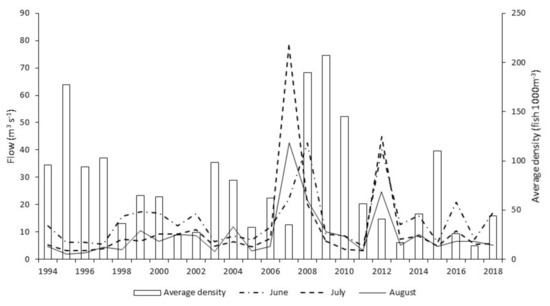 Graph showing the variation in annual hydroacoustic fish density (all reaches—fish 1000 m−3) with mean daily flows (m3 s−1) for June, July and August from 1994 to 2018.