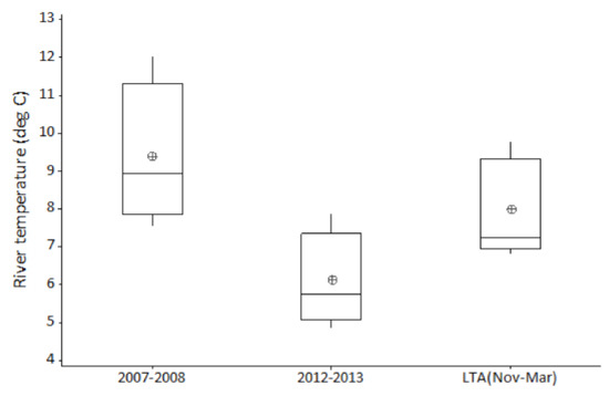 One-way ANOVA analysis comparing temperatures in 2007 and 2008 with 2012 and 2013 during the warmest months, when growth and recruitment are maximal (May–September), revealed no significant difference (p > 0.05; df =18) between periods. ANOVA analysis comparing the main overwintering periods (November–March) for 2007/2008 and 2012/2013 and the long term average (LTA) for the same months revealed a statistically significant difference (p < 0.05; df = 13) in water temperature (Figure 8) between the periods. The earlier period was found to be statistically similar to the LTA, with the later period significant colder than the LTA. Confirmation was provided by conducting a t-test comparing temperature for 2007–2008 with 2012–2013 only for this overwintering period which showed a statistically significant difference (p < 0.05; df = 5).